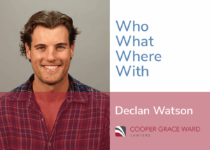 Who, what, where with lawyer Declan Watson. Hear how long he’s been at Cooper Grace Ward Lawyers, what he would be doing if he wasn’t working in law and what he loves about his job.